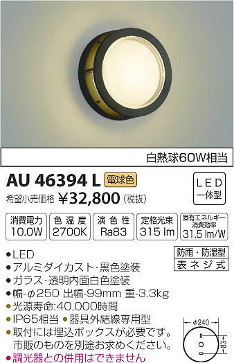 商品カテゴリ一覧 > LED照明器具 > AU46394L コイズミ ポーチライト LED(電球色)