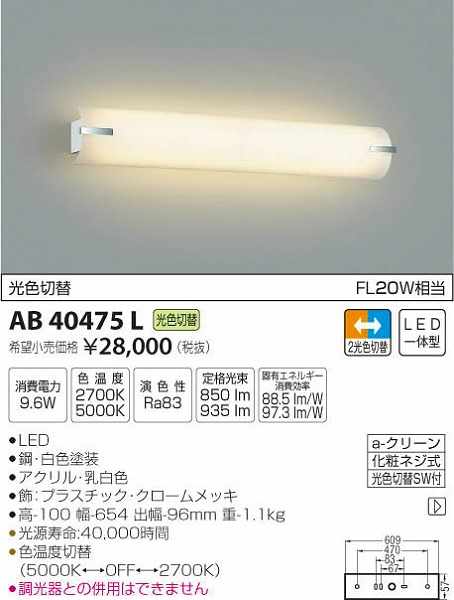 | 商品について | FL20W相当 ●LED ●鋼・白色塗装 ●アクリル・乳白色 ●飾:プラスチック・クロームメッキ ●高-100 幅-654 出幅-96mm 重-1.1kg ●消費電力:9.6W ●色温度:2700K 5000K ●演色性:Ra83 ●定格光束:850 935 lm ●固有エネルギー消費効率:88.5 97.3 lm/W ●光源寿命:40000時間 ●色温度切替(5000K←→OFF←→2700K) ●調光器との併用はできません |