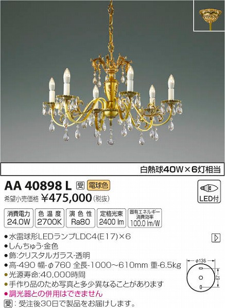 | 商品について | 白熱球40W×6灯相当 ●水雷球形LEDランプLDC4(E17)×6 ●しんちゅう・金色 ●飾:クリスタルガラス・透明 ●高-490 幅-φ760 全長-1000〜610mm 重-6.5kg ●消費電力:24.0W ●色温度:2700K ●演色性:Ra80 ●定格光束:2400 lm ●固有エネルギー消費効率:100.0 lm/W ●光源寿命:40000時間 ●手作り品のため写真と多少異なることがあります ●調光器との併用はできません |