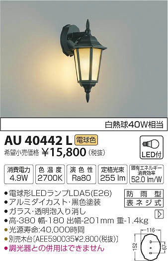 | メーカー / 型番 | コイズミ照明 AU40442L ポーチライト |