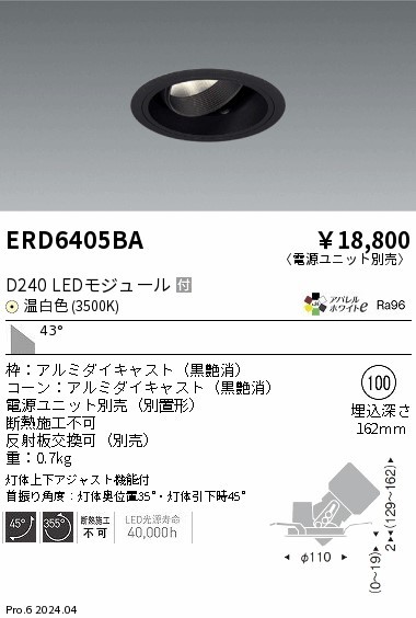 | メーカー / 型番 | 遠藤照明 ERD6405BA ユニバーサルダウンライト |