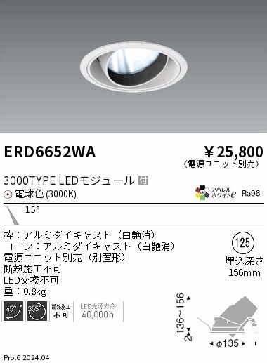 | メーカー / 型番 | 遠藤照明 ERD6652WA ユニバーサルダウンライト |