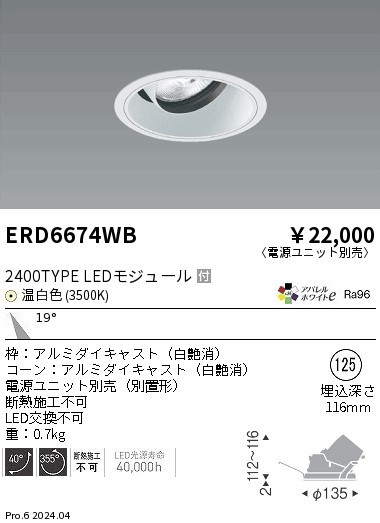 | メーカー / 型番 | 遠藤照明 ERD6674WB ユニバーサルダウンライト |