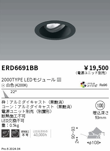 | メーカー / 型番 | 遠藤照明 ERD6691BB ユニバーサルダウンライト |