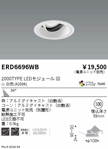 | メーカー / 型番 | 遠藤照明 ERD6696WB ユニバーサルダウンライト |