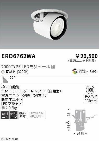 | メーカー / 型番 | 遠藤照明 ERD6762WA ユニバーサルダウンライト |