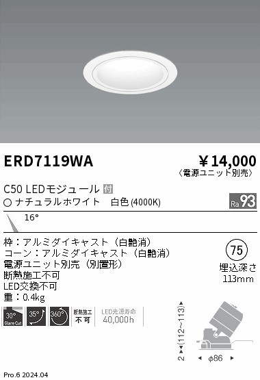 | メーカー / 型番 | 遠藤照明 ERD7119WA ユニバーサルダウンライト |