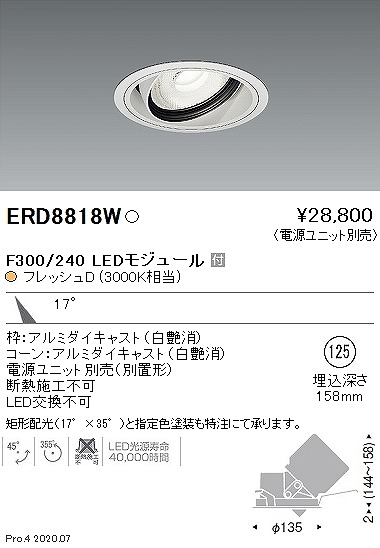 | メーカー / 型番 | 遠藤照明 ERD8818W ユニバーサルダウンライト 生鮮食品用 |