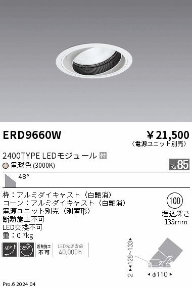 | メーカー / 型番 | 遠藤照明 ERD9660W ユニバーサルダウンライト |