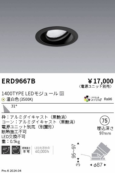| メーカー / 型番 | 遠藤照明 ERD9667B ユニバーサルダウンライト |