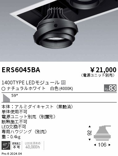 | メーカー / 型番 | 遠藤照明 ERS6045BA ユニバーサルダウンライト 灯体ユニットのみ |