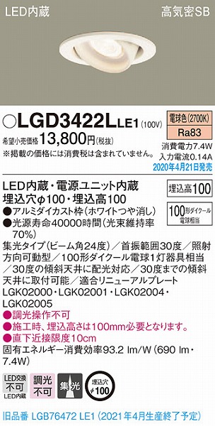| メーカー / 型番 | パナソニック LGD3422LLE1 ユニバーサルダウンライト |