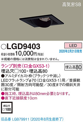 | メーカー / 型番 | パナソニック LGD9403 角型ユニバーサルダウンライト |