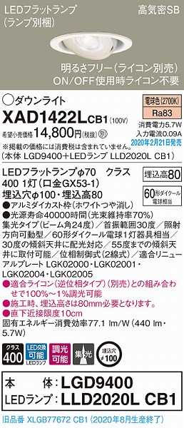 | メーカー / 型番 | パナソニック XAD1422LCB1 ユニバーサルダウンライト |