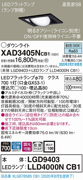 | メーカー / 型番 | パナソニック XAD3405NCB1 角型ユニバーサルダウンライト |