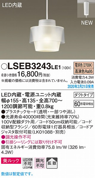 | メーカー / 型番 | パナソニック LSEB3243LE1 レール用ペンダントライト |