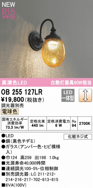 商品カテゴリ一覧 > ブラケットライト > OB255127LR オーデリック ブラケットライト アンバー LED 電球色 調光