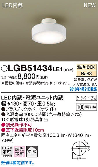| メーカー / 型番 | パナソニック LGB51434LE1 小型シーリングライト |