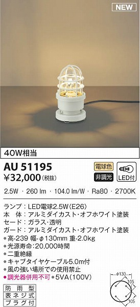 | 商品について | 40W相当 ランプ:LED電球2.5W(E26) 本体:アルミダイカスト・オフホワイト塗装 セード:ガラス・透明 ガード:アルミダイカスト・オフホワイト塗装 ●高-239 幅-φ130mm 重-2.0kg ●消費電力:2.5W ●定格光束:260 lm ●固有エネルギー消費効率:104.0 lm/W ●演色性:Ra80 ●色温度:2700K ●光源寿命:20000時間 ●二重絶縁 ●キャブタイヤケーブル5.0m付 ●風の強い場所での使用禁止 ●調光器併用不可 ●5VA(100V) |