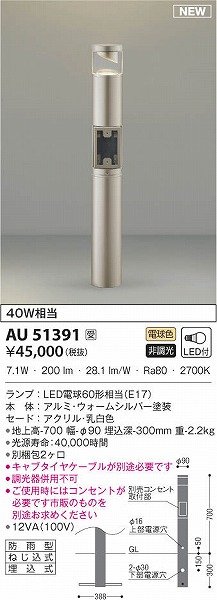 | 商品について | 60W相当 ランプ:LED電球40形相当(E26) 本体:アルミ・ウォームシルバー塗装 セード:アクリル・乳白色 ●地上高-700 幅-φ90 埋込深-300mm 重-2.2kg ●消費電力:4.4W ●定格光束:390 lm ●固有エネルギー消費効率:88.6 lm/W ●演色性:Ra80 ●色温度:2700K ●光源寿命:40000時間 ●別梱包2ヶ口 ●キャブタイヤケーブルが別途必要です ●調光器併用不可 ※ご使用時にはコンセントが必要です市販のものを別途お求めください ●7VA(100V) |