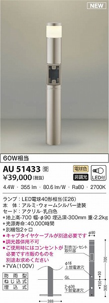 | 商品について | 60W相当 ランプ:LED電球40形相当(E26) 本体:アルミ・ウォームシルバー塗装 セード:アクリル・乳白色 ●地上高-700 幅-φ90 埋込深-300mm 重-2.2kg ●消費電力:4.4W ●定格光束:390 lm ●固有エネルギー消費効率:88.6 lm/W ●演色性:Ra80 ●色温度:2700K ●光源寿命:40000時間 ●別梱包2ヶ口 ●キャブタイヤケーブルが別途必要です ●調光器併用不可 ※ご使用時にはコンセントが必要です市販のものを別途お求めください ●7VA(100V) |