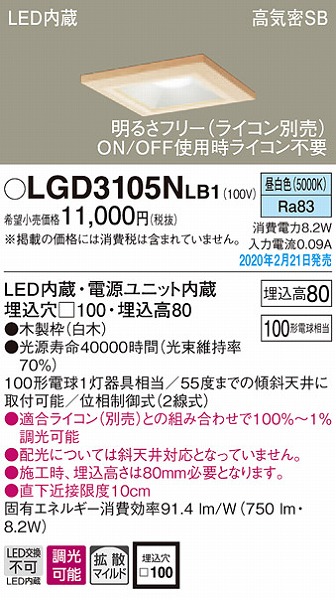商品カテゴリ一覧 > 和風照明器具 > LGD3105NLB1 パナソニック 和風ダウンライト 白木 □100 LED 昼白色 調光 拡散 (LGB76360LB1 推奨品)