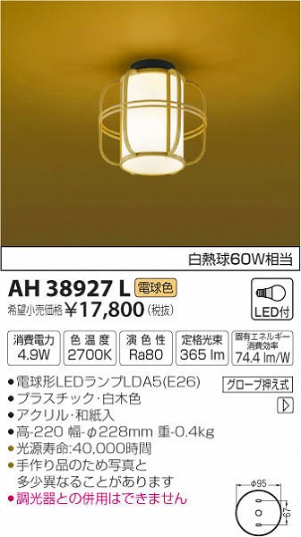 | メーカー / 型番 | コイズミ照明 AH38927L 和風小型シーリングライト |