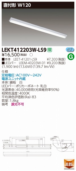 | メーカー / 型番 | 東芝ライテック LEKT412203W-LS9 ベースライト |