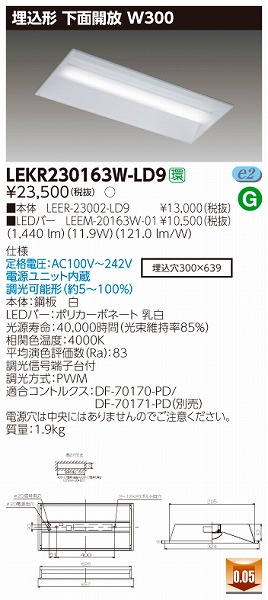 | メーカー / 型番 | 東芝ライテック LEKR230163W-LD9 埋込ベースライト |