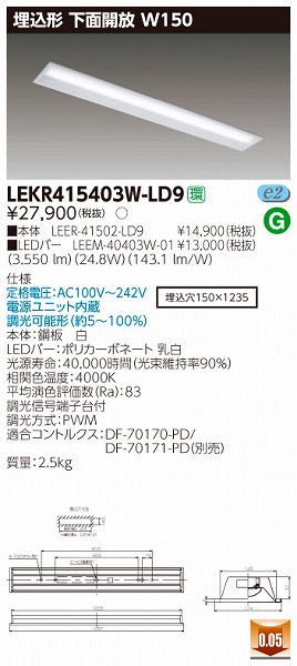 メーカー / 型番 東芝ライテック LEKR415403W-LD9 埋込ベースライト