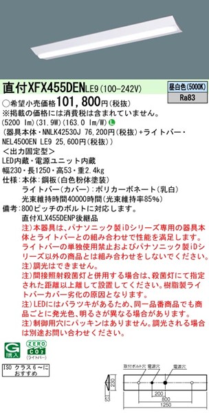 | メーカー / 型番 | パナソニック XFX455DENLE9 クリーンルーム向けベースライト 40形 逆富士型 |