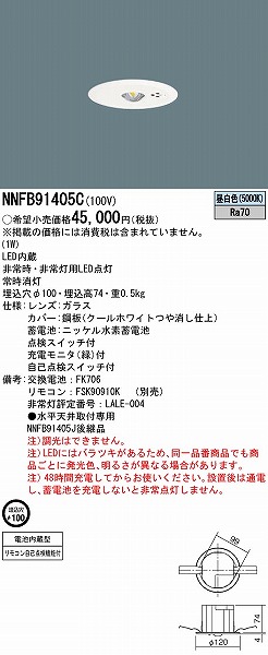 | メーカー / 型番 | パナソニック NNFB91405C 非常用照明器具 断熱/遮音施工用 |