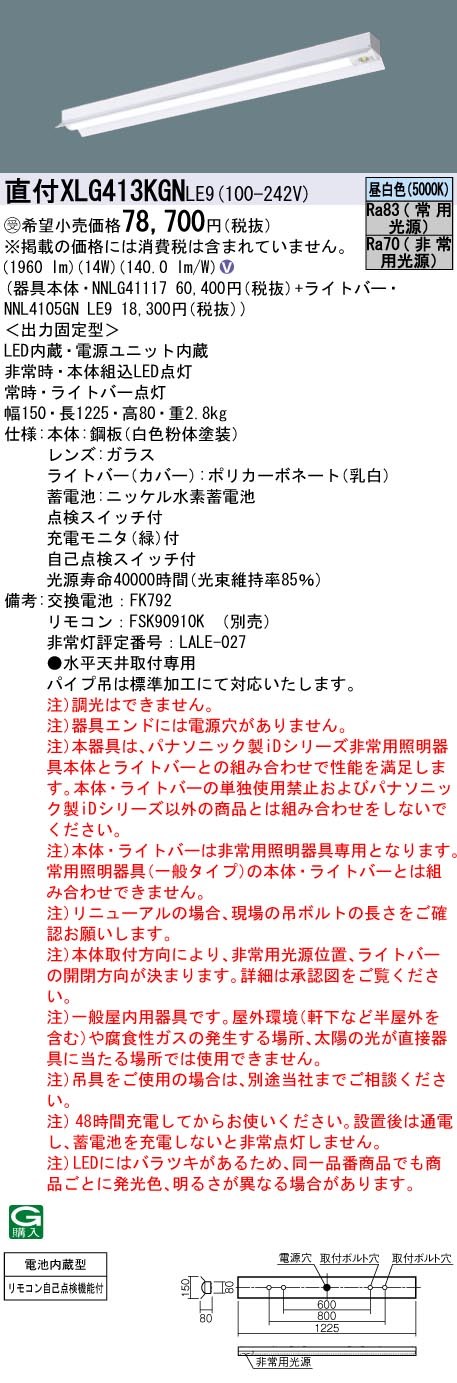 | メーカー / 型番 | パナソニック XLG413KGNLE9 非常用ベースライト 40形 |