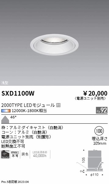 | メーカー / 型番 | 遠藤照明 SXD1100W ベースダウンライト 浅型 |