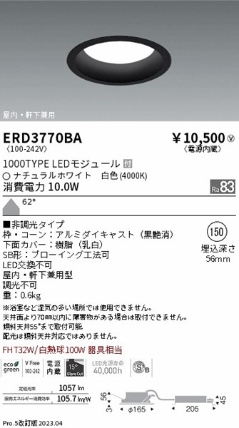 | メーカー / 型番 | 遠藤照明 ERD3770BA 軒下用ダウンライト |