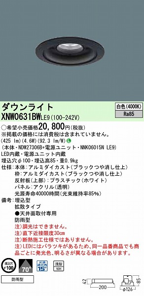 | メーカー / 型番 | パナソニック XNW0631BWLE9 軒下用ダウンライト |