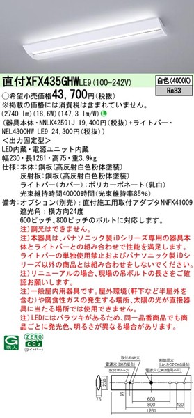 | メーカー / 型番 | パナソニック XFX435GHWLE9 ベースライト 40形 学校用 |