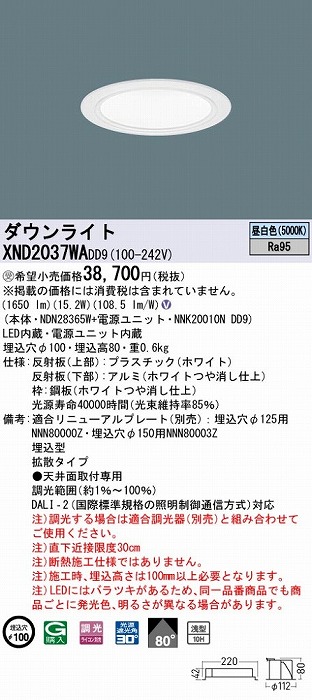| メーカー / 型番 | パナソニック XND2037WADD9 ダウンライト |