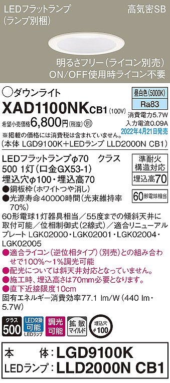 | メーカー / 型番 | パナソニック XAD1100NKCB1 ダウンライト |