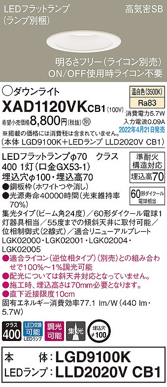 | メーカー / 型番 | パナソニック XAD1120VKCB1 ダウンライト |