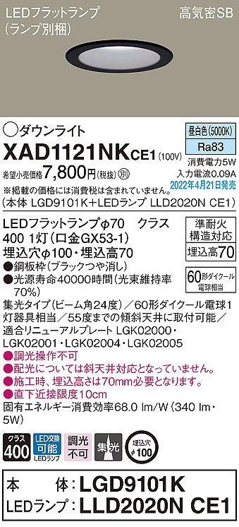 | メーカー / 型番 | パナソニック XAD1121NKCE1 ダウンライト |