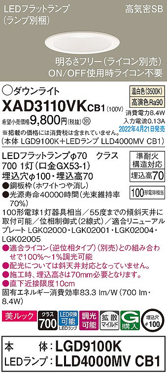 | メーカー / 型番 | パナソニック XAD3110VKCB1 ダウンライト |