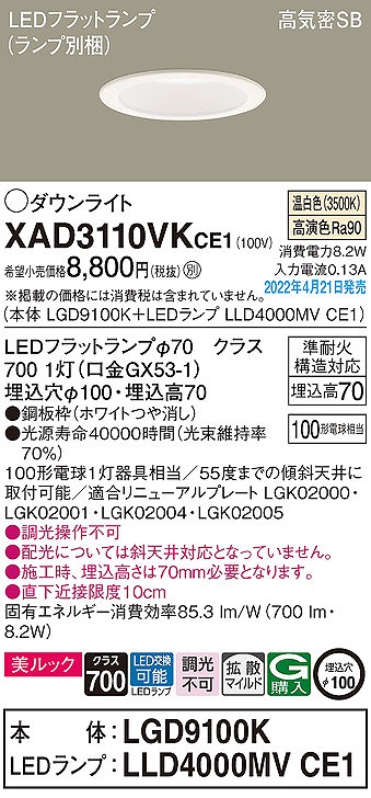 | メーカー / 型番 | パナソニック XAD3110VKCE1 ダウンライト |