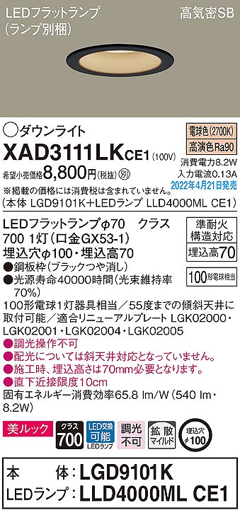 | メーカー / 型番 | パナソニック XAD3111LKCE1 ダウンライト |