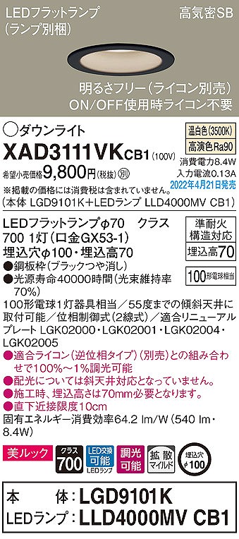 | メーカー / 型番 | パナソニック XAD3111VKCB1 ダウンライト |