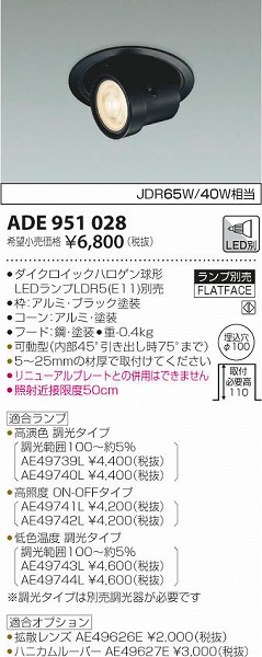 | 商品について | JDR65W/40W相当 ●ダイクロイックハロゲン球形LEDランプLDR5(E11)別売 ●ブラック塗装 ●コーン:アルミ・ブラック塗装 ●灯具:ブラック塗装 ●幅-φ116 出幅-49 埋込穴径-φ100 埋込高-110 取付必要高-110mm 重-0.4kg ●可動型(内部45°引き出し時75°まで) ●別売ランプ〔AE48004L \8800(税抜)〕〔AE48005L \8800(税抜)〕〔AE48254L \10000(税抜)〕〔AE48255L \10000(税抜)〕〔AE48256L \10000(税抜)〕〔AE48257L \10000(税抜)〕 ●別売適合調光器〔AE36745E \12000(税抜)〕 ●5〜25mmの材厚で取付けてください ●リニューアルプレートとの併用はできません ●照射近接限度50cm |