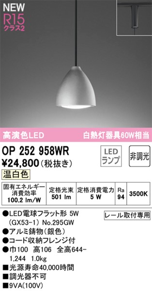OP252958WR オーデリック レール用ペンダントライト シルバー LED(温白色)