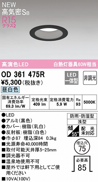 | メーカー / 型番 | オーデリック OD361475R 浴室灯・軒下用ダウンライト |