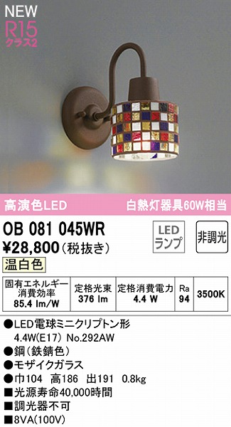OB081045WR オーデリック ブラケットライト 鉄錆色/モザイクガラス LED(温白色)