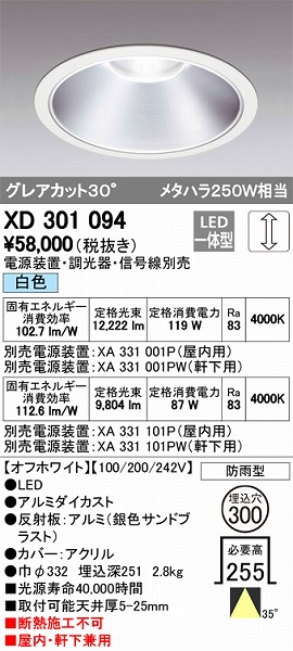 | メーカー / 型番 | オーデリック XD301094 屋内屋外兼用ダウンライト |